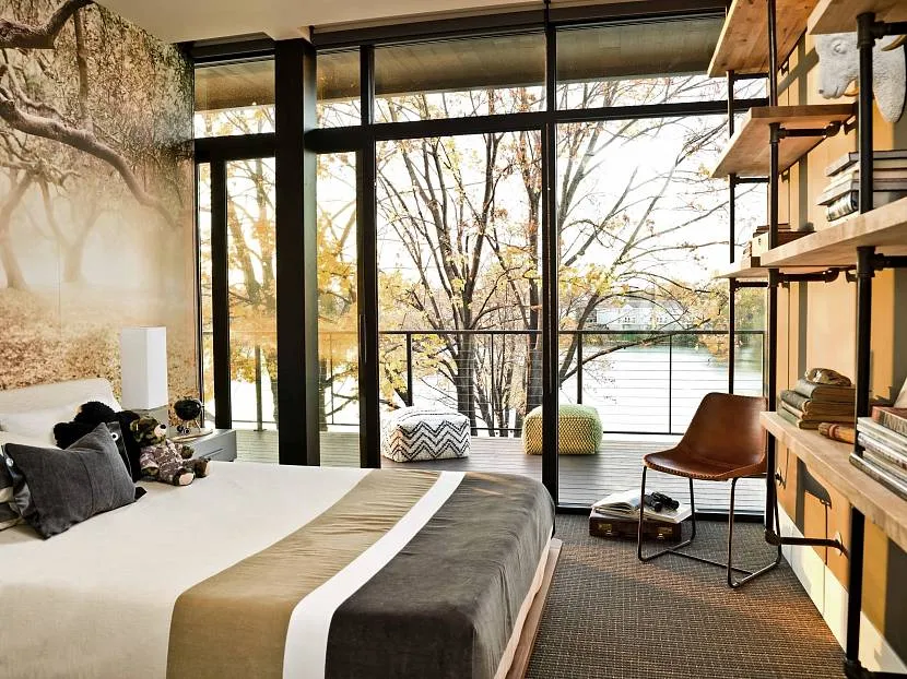 Крепление оконных рам во всю стену в обычной спальне – сомнительное мероприятие. Комната предназначена для отдыха и уединения. Обеспечивать интенсивное естественное освещение в ней нет необходимости. Единственный повод установить стеклопакет в пол – эффектный вид.