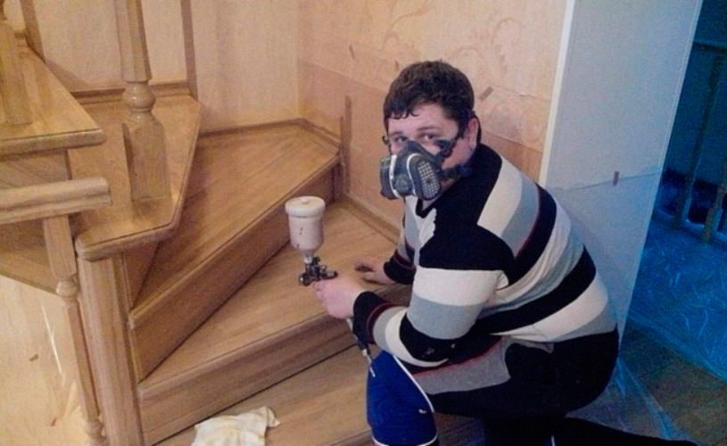 Перед выполнением покраски своими руками следует вооружиться защитным обмундированием: очками, перчатками и респиратором. Это обусловлено тем, что лаки бывают токсичными и халатное отношение к своему здоровью может обернуться серьезными проблемами. Кроме того, отделка лестничной конструкции должна проводиться в помещениях с открытыми окнами.