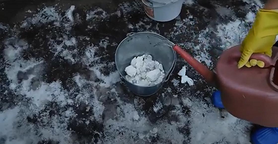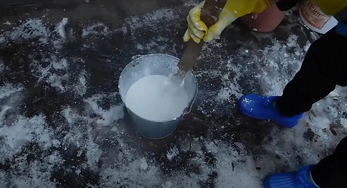 Заливка воды в ведро с известью: YouTube/Деревенька моя