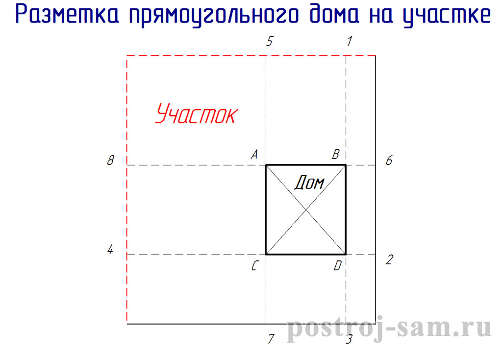 Начнем с самого простого примера, когда участок, как и дом, имеет прямоугольную форму (см. схему выше). Не имея специальных, дорогостоящих инструментов под рукой, на мой взгляд, самый простой способ произвести разметку фундамента будет следующий: