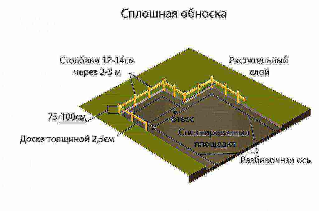 В завершение всех земляных работ обноску снова восстанавливают, здесь сориентироваться помогают дополнительные колышки, вбитые в грунт на расстояние до 3 м от самой обноски, которые являются продолжением ее линий.