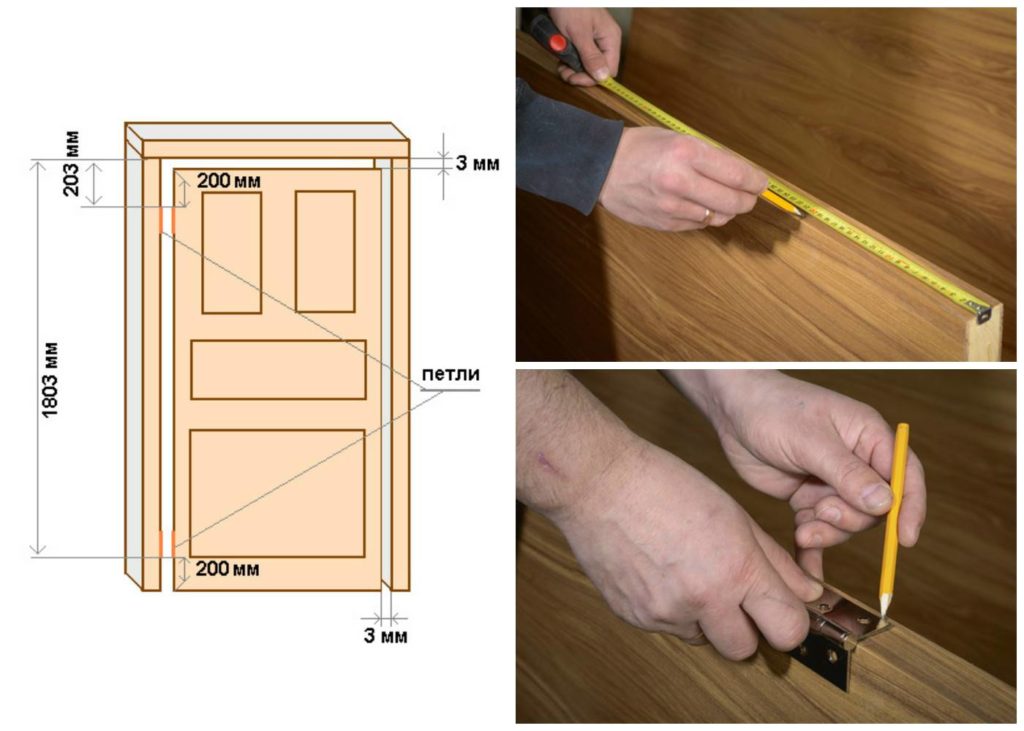 - от края верхней петли до края полотна должно быть 200 мм, столько же должно быть от края нижней петли до края полотна;