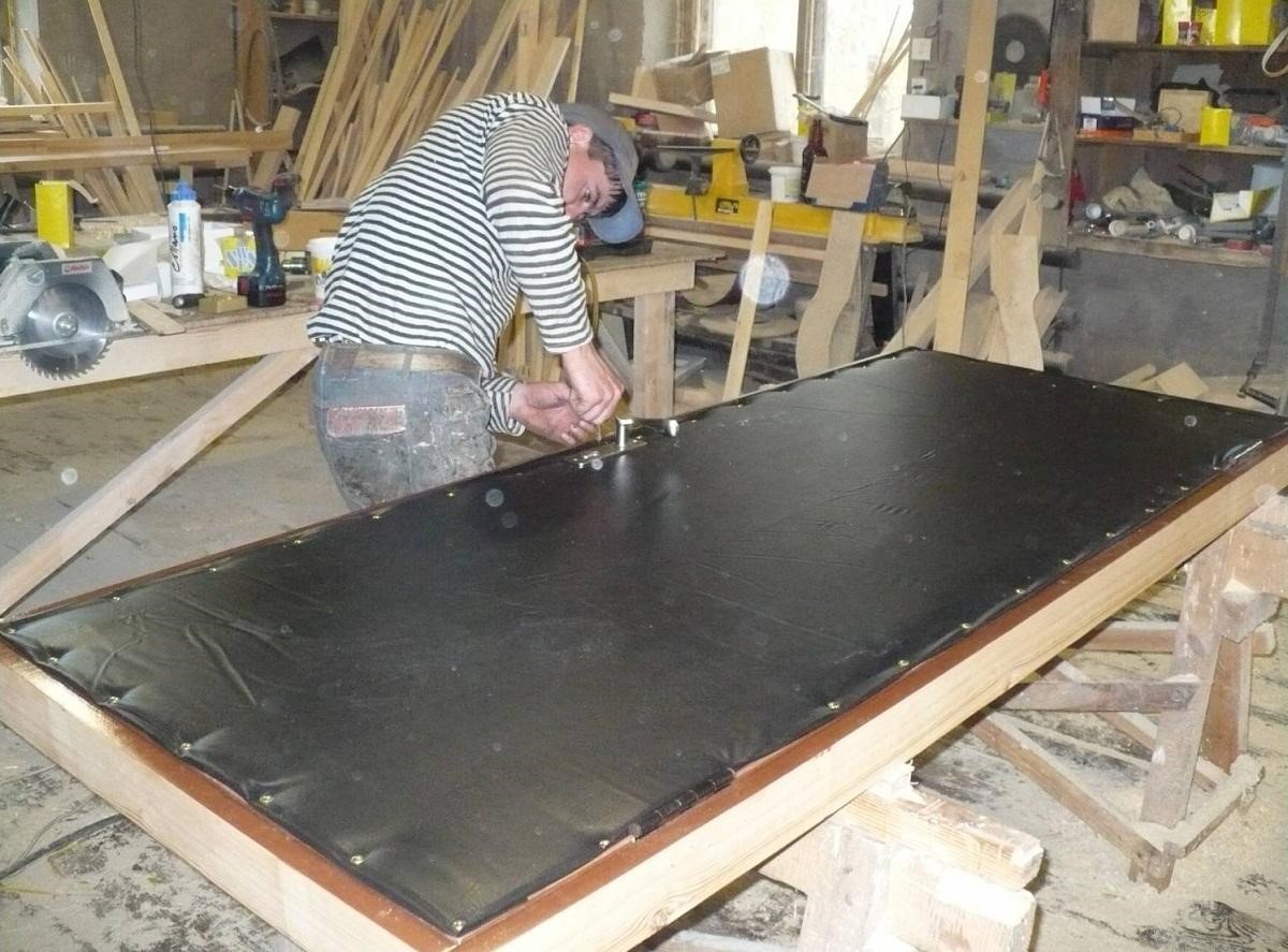Выбрать качественный, подходящий по цвету дермантин, который еще называют «искусственная кожа» сейчас не проблема. Кстати, качественный дермантин должен немного пружинить при растягивании. Утеплителей тоже имеется в продаже предостаточно. Есть пенопропиленовые рулонные утеплители различной толщины. Они очень удобны в работе. И все остальное также приобретается по отдельности. Также, никто не отменял творчество, наоборот, только приветствуется. Всегда можно придумать и применить что-то свое. Наша задача предупредить начинающих мастеров от ошибок и помочь тем, кто делает первый раз, т.е. дать основу классической технологии. Дальше человек будет усовершенствовать уже сам.