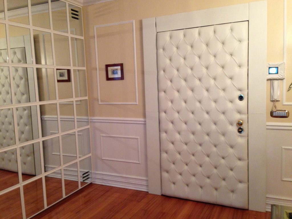 Обивка кожзаменителем. Такой вариант отделки известен многим потребителям ещё с советских времён – на металлическое полотно наклеивается ватин, который закрывается кожзаменителем. После фиксации материала, его поверхность стягивается с помощью гвоздей и проволоки.