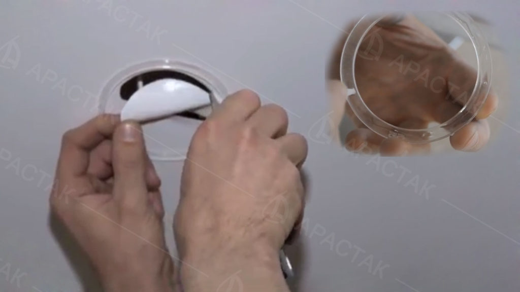 Важно правильно позиционировать кольцо на потолке — второго шанса не будет. Если кольцо плотно прижать к пленке фиксация происходит практически мгновенно