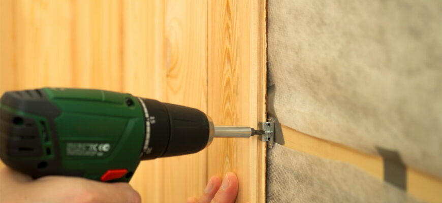 При сооружении обрешетки из древесных материалов, все ее составляющие необходимо предварительно вскрыть антисептиком. По начертанным полосам при помощи перфоратора осуществляется сверление отверстий под дюбели на дистанции 0,5 м. Далее нужно приложить рейки, выровнять их по горизонтали и зафиксировать на поверхности стены. В местах неровностей под каркас следует уложить клинья из древесины. Идущие по стене провода необходимо скрыть под отделкой, для чего требуется осуществить замеры, просверлить отверстия в поверхности и закрепить их посредством хомутов таким образом, чтобы не было выглядывания из-за плоскости каркаса.
