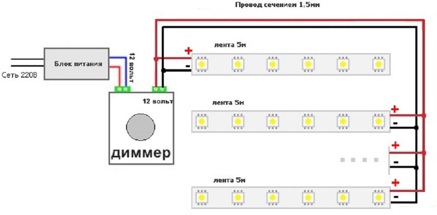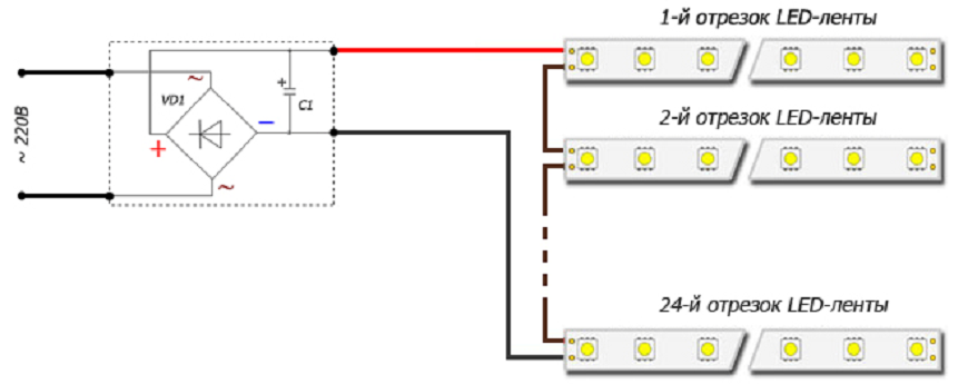 Подключение светодиодной ленты к блоку питания последовательное