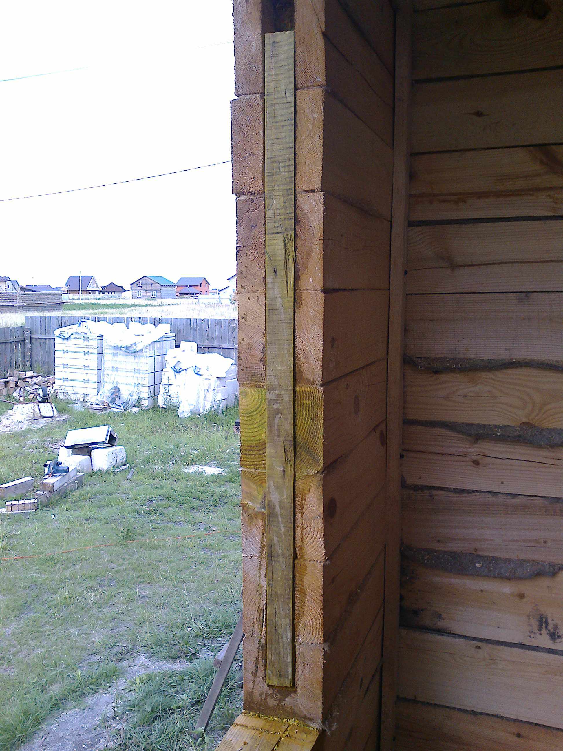 Затем устанавливаются вертикальные бруски, в пазы которых также укладывается льноткань или джут. И в последнюю очередь устанавливается верхних брус окосячки. Усадочный зазор, который необходимо оставить над окосячкой, закрывается льнотканью.