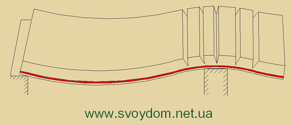 По установленным стойкам укладывают ригели из металлического проката, роль ригелей – поддержание щитов опалубки. Непосредственно на ригели укладывают горизонтальную «палубу» из деревянных щитов или фанеры.