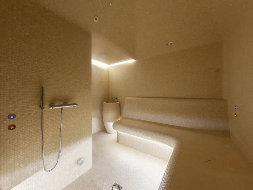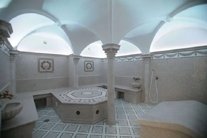В такой бане все выполнено из высококачественного мрамора, а внутри особая атмосфера. Температура редко превышает показатель в 30-35°C, а вот влажность, наоборот, самая высокая из возможных, и доходит до 100%.