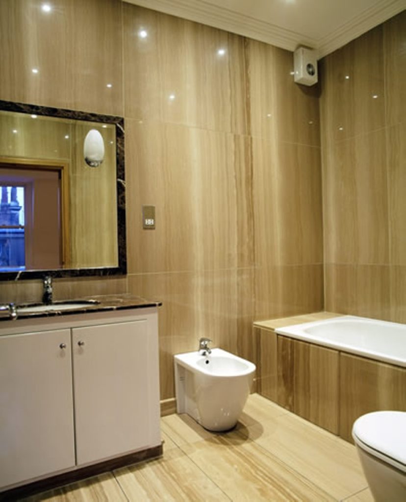 Лучше подбирать материалы для отделки стен и потолка одновременно, с учетом потребности в скрытии коммуникаций, сочетаемости с сантехникой, напольной плиткой и стилем. Визуально расширить помещение кроме светлых оттенков помогает глянец (при условии достаточного освещения) и холодные тона (морские мотивы, бирюза, голубой, светло-зеленый цвет). Беж, имитация мраморных разводов, пастельные тона уместны при отделке ванных в стиле Прованс, блестящие однотонные панели – при реализации современных интерьеров. При планировании отделки ванной в эко-стиле применять лучше панели, имитирующих светлую древесину.