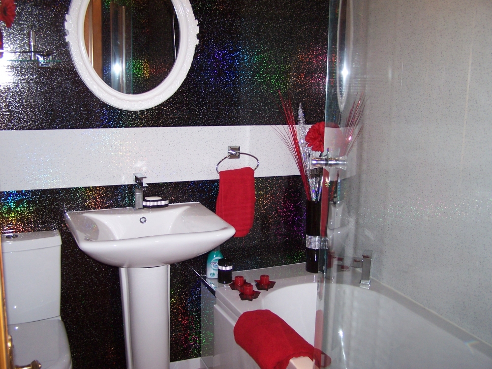 В том случае, если жилье оформлено в стиле модерн, то для отделки ванной правильным решением станет обшивка пластиком красного и черного цвета. Такая необычная комбинация цветов выглядит эффектно и современно. Кроме этого, обстановку в помещении поможет разбавить не только чередование контраста, но и панелей разной ширины.