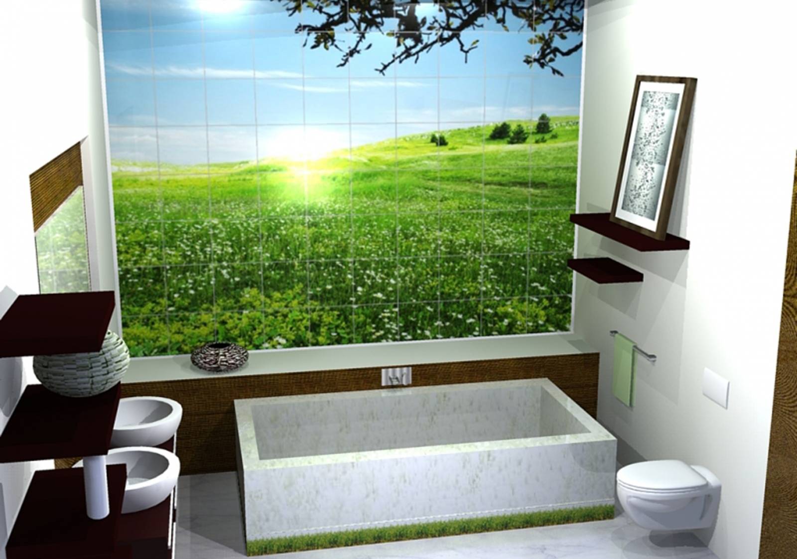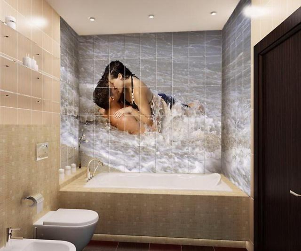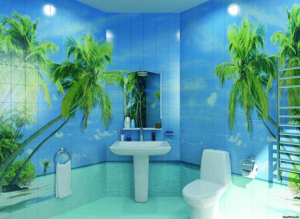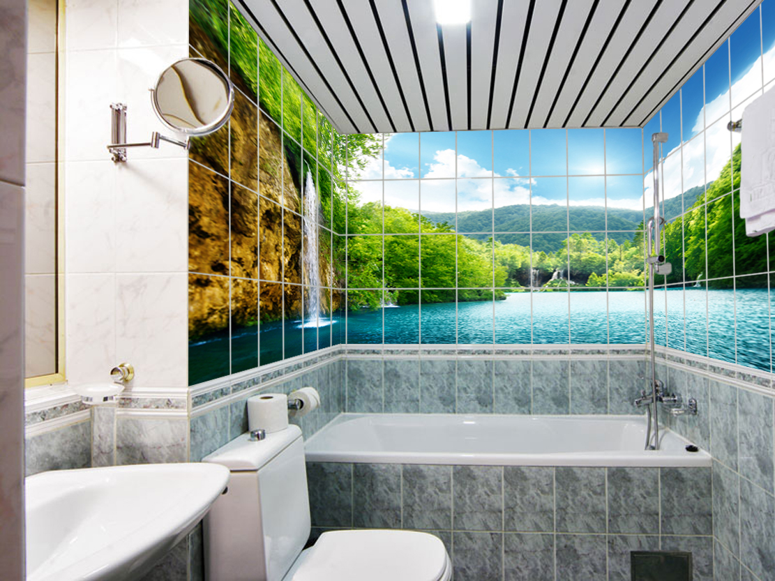 Благодаря современным методам фотопечати появилась также возможность разместить в ванной комнате не только пейзажи любимых мест, но и семейные фотографии. Чтобы подчеркнуть такой дизайн, необходимо в помещении выполнить декор элементами из металла и стекла. Если же, наоборот, хочется получить комфортную, но скромную ванную, то необходимо для облицовки выбирать пластик пастельных тонов, к нему не потребуется приобретать дорогую мебель, а интерьер интересно украсят керамические кувшины и узоры цветов. Придаст такой комнате привлекательность и обшитый аналогичными панелями потолок, при этом желательно монтаж сделать из реечных панелей с зеркальными вставками.