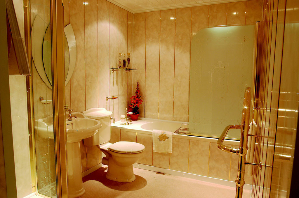 Любителям классического стиля, несмотря на широкий ассортимент расцветок, лучше всего отдавать предпочтение материалу теплых тонов и избегать крупных рисунков. Такая облицовка идеально будет сочетаться с оттенками золота на дверях и декоративными элементами в комнате. Можно также в ванной выделить отдельную зону и обшить ее пластиком под натуральный камень. Если же отделка из ПВХ послужит основой для дизайна в ванной, то чтобы подчеркнуть стиль и шик помещения, желательно тщательно обдумать все детали. Например, в просторной комнате рекомендуется полностью заменить керамическую плитку и установить на стенах и потолке глянцевые панели глубокого цвета. Они хорошо будут гармонировать с набором техники и наполнят ванную светом, визуально расширяя пространство.