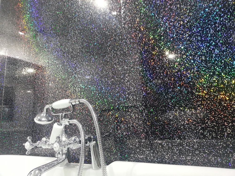 На изысканный вкус владельцев жилья укажут ПВХ-панели с блестками, которые обычно применяют для декора стен