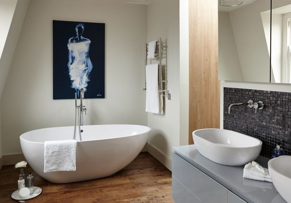 Перед монтажом полотенцесушитель прикладывают к стене, проверяют, можно ли к нему дотянуться, не мешает ли другое оборудование. Слишком низко размещать не стоит — пол в ванной часто влажный.