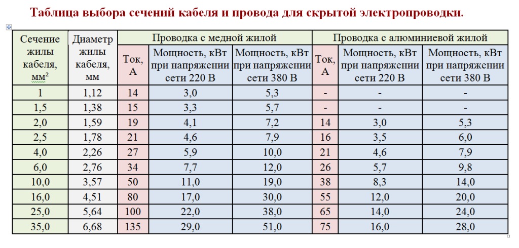 Как видите по таблице, вы легко по силе тока определите сечение необходимого кабеля. Более того вы можете это сделать даже по расчётной мощности включаемый приборов.
