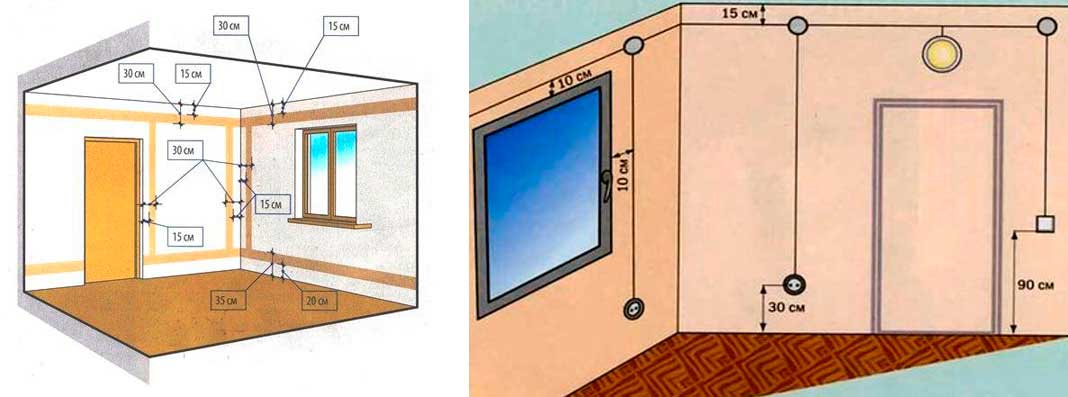 - допустимые расстояния от элементов помещения – для горизонтальных штроб не менее 150 мм от потолка или пола, вертикальных не менее чем 100 мм от углов, краев дверных и оконных проемов, ниш и колонн;