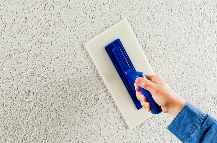 Наносится декоративная штукатурка «Короед» простым шпателем или кельмой. Лучше всего сочетать эти инструменты. Профессиональный подход заключается в том, чтобы шпатель окунать в ёмкость и доставать определённое количество смеси, а потом перекладывать её на кельму. Сначала проводят касательные движения кельмой снизу вверх. Шпатель при этом держат под углом 60 градусов.