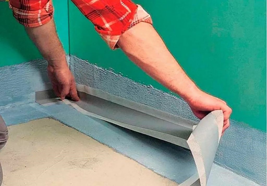 - Укладка гидроизоляции. Используется обычная полиэтиленовая пленка. Можно и обойтись, но в случае попадания воды есть шанс сохранить деревянное основание. Гидроизоляция укладывается полосами внахлест 15-20 см, стыки полос в обязательном порядке проклеиваются специальной клейкой лентой. Края полос заворачиваются на стены на 10-15 см, впоследствии они обрезаются.