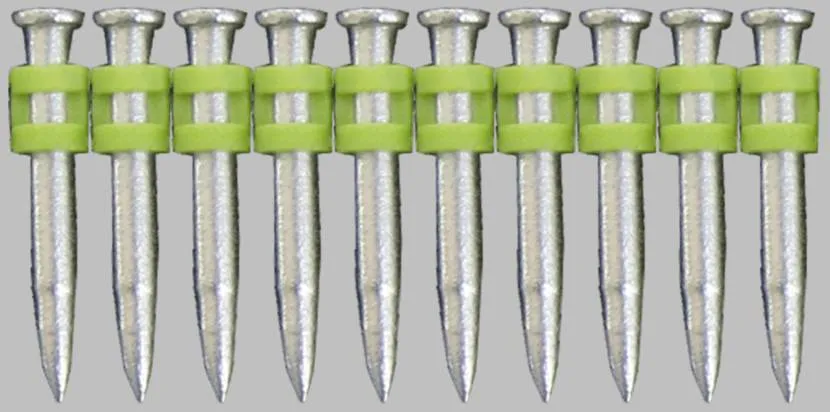Для монтажа при помощи пневматического пистолета используются специальные крепежи, которые по своему строению напоминают гвоздь-клин. Такие крепежи снабжены специальной шайбой, которая гарантирует прочный монтаж изделия в твердую поверхность. При пристреле шайба перемещается от конца гвоздя к его головке и обеспечивает надежную фиксацию.