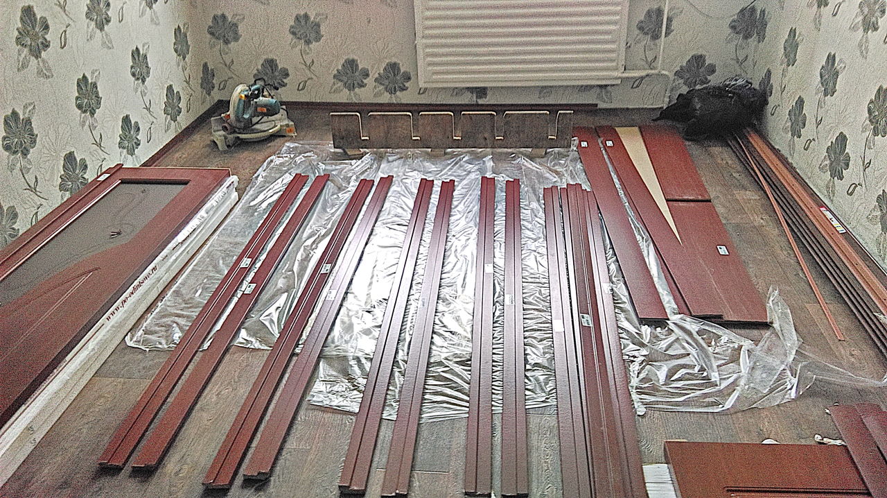 - Собрать дверной короб. Составные части необходимо разложить в нужном порядке, учитывая при этом то, в каком направлении будет открываться полотно.