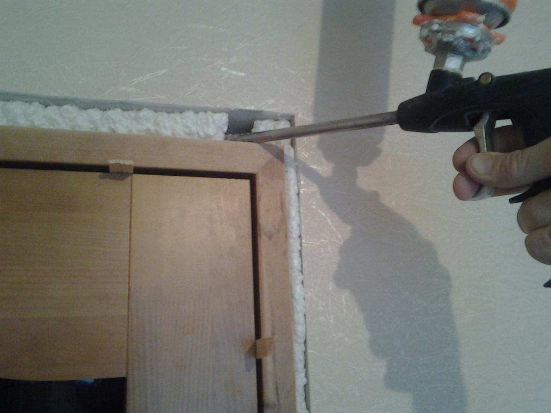 В случае, если зафиксированная клиньями или брусками коробка в проеме выставлена по уровню, то есть вертикальные планки строго параллельны друг другу, а горизонтальная – уровню пола, можно приступать к навешиванию полотна и запениванию.