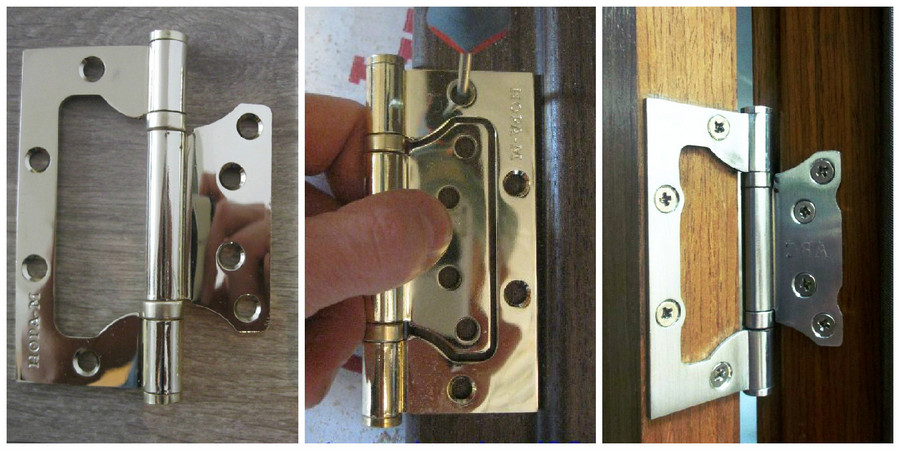 Для того чтобы установить двери на петли бабочка, не нужно в дверной конструкции, а также в коробке вырезать специальные пазы. В полностью развернутом виде боковые стороны конструкции имеют сходство с крыльями бабочек, вследствие чего они получили такое название. Если ее, сложить, то можно заметить, что одна половинка вкладывается в другую, что в свою очередь обеспечивает минимальный зазор между полотном и коробкой.