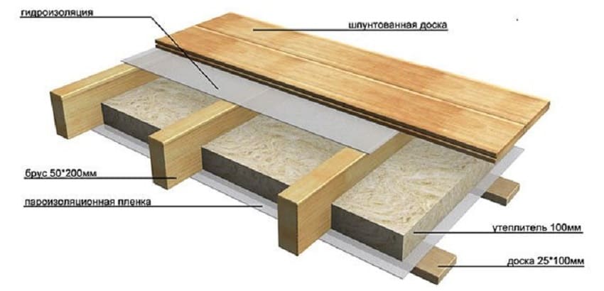 - между деревянными лагами прокладывается утеплитель. В зависимости от используемого материала толщина этого слоя может быть разной. В любом случае она не должна превышать размеров самих лаг;