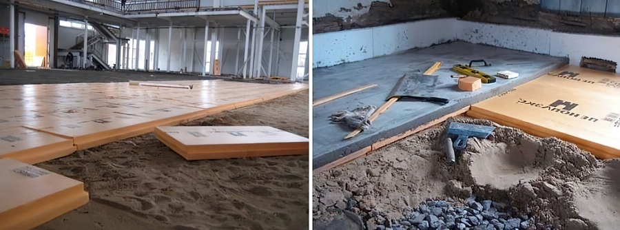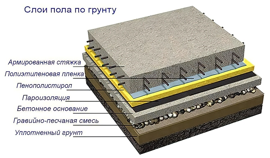 Пол по грунту представляет собой многослойный «пирог», в состав которого обязательно входит и утеплитель, часто — нескольких видов.