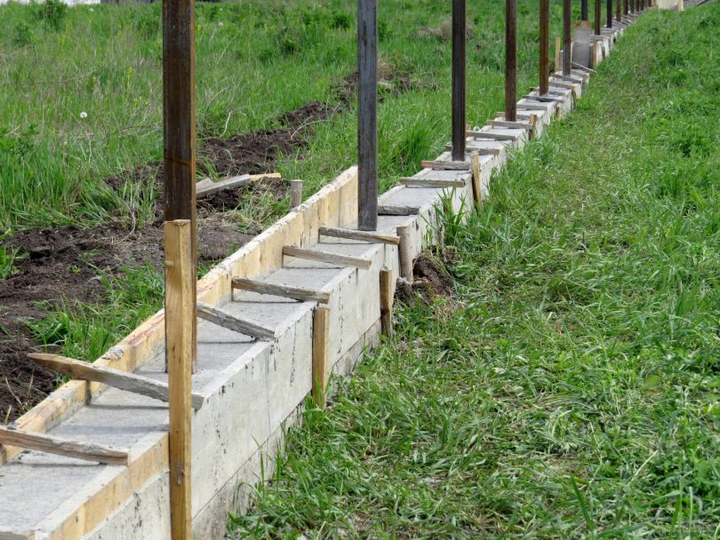- Монтажом столбов на цоколь из бетона . Для этого по периметру ограды создается ленточный фундамент, возводится опалубка на 20 см выше грунта, армируется, монтируются опоры, выполняется заливка бетоном.