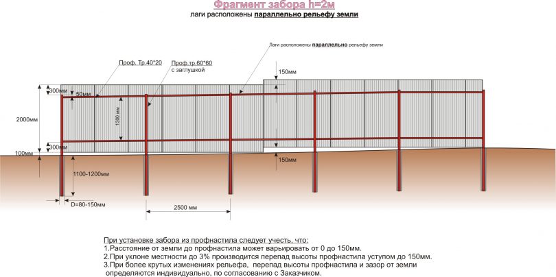 Сначала весь участок перемеряется с помощью рулетки и уровня. Это поможет разобраться, с каким типом металлической конструкции лучше работать. По периметру вбиваются колышки. Их соединяют капроновым шнуром и вымеряют точные размеры будущего сооружения. При этом следует помнить и о калитке с воротами. Их также можно установить, как и забор из профнастила своими руками. Если монтаж забора будет проводиться на неровной поверхности, идеальным вариантом будет установка секционного ограждения согласно данному рисунку.
