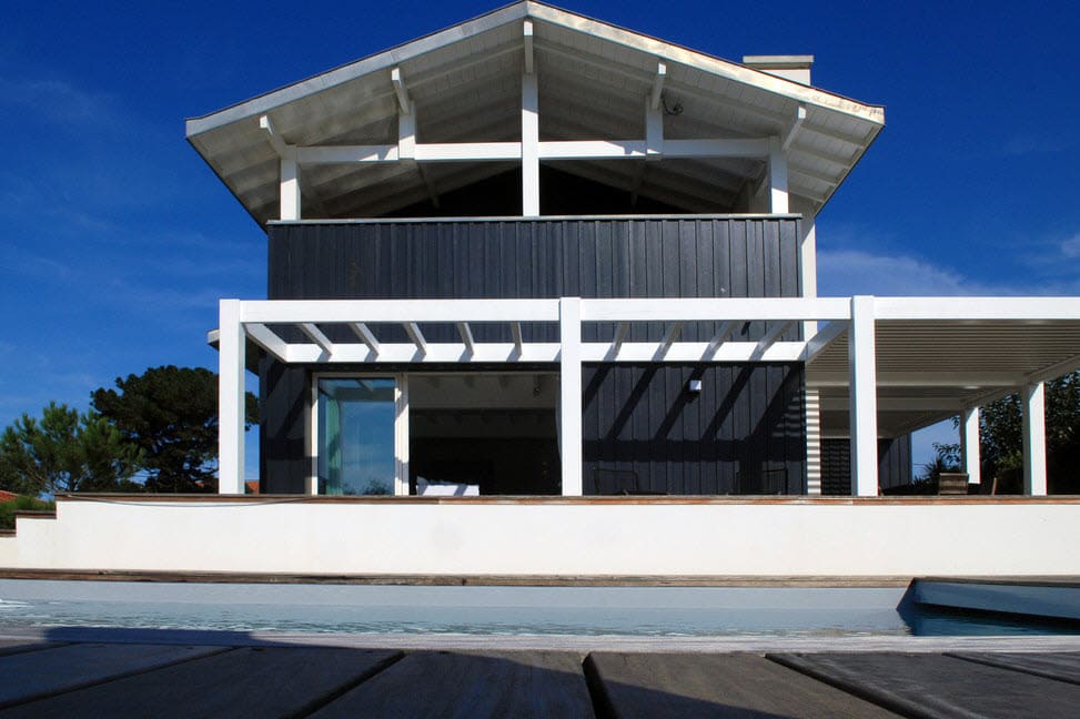 - Простота общего принципа является основой для бесконечного количества вариаций. Двускатная крыша слишком проста для вас? А если удлинить конек и организовать вдоль одного из торцов террасу? А если расположить конек не посередине здания? А если разбить скучный протяженный скат слуховым окном? Декоративной башенкой?