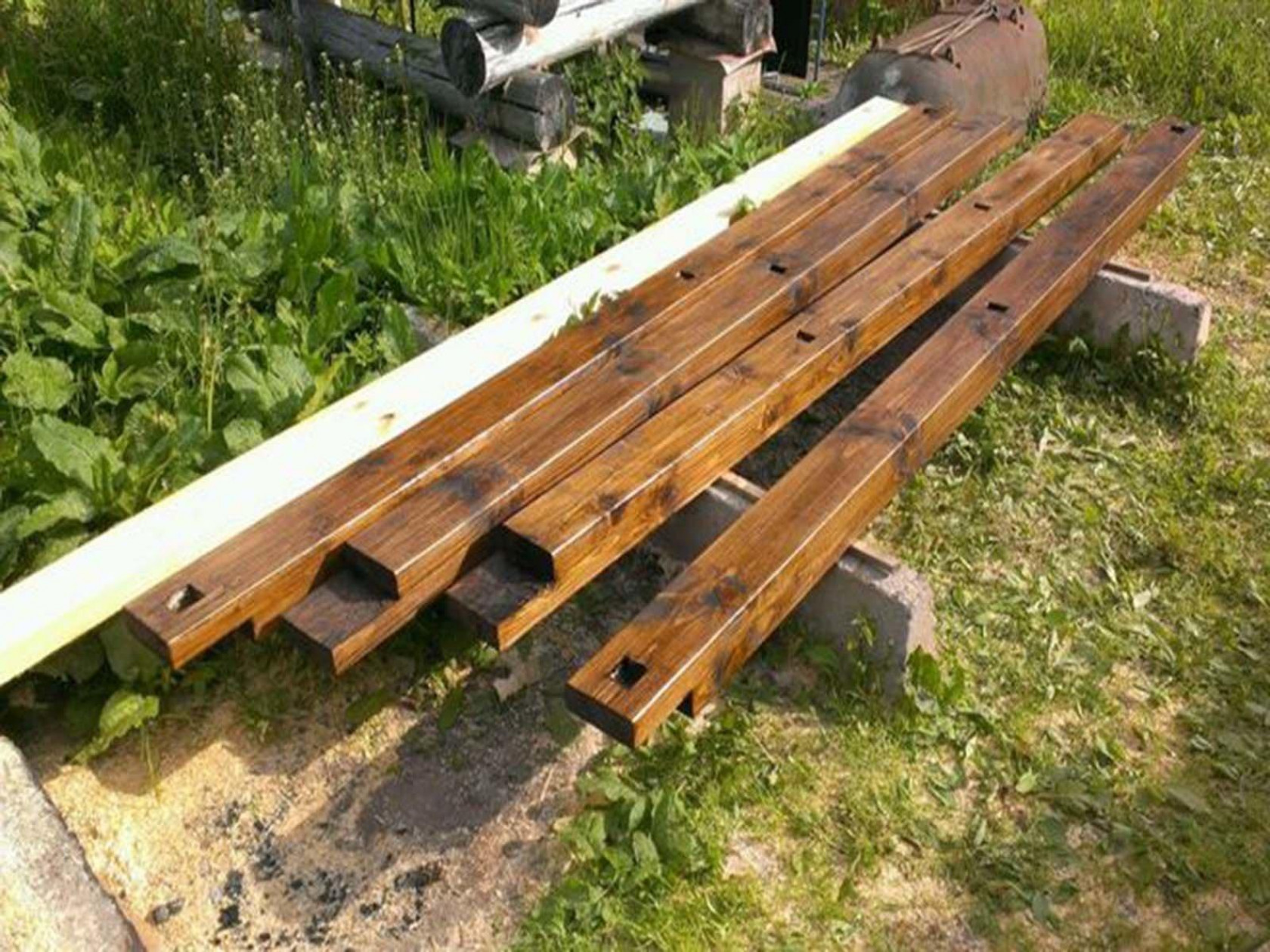 Нижние края брусьев, которые будут спрятаны в грунте, покрывают составом, предохраняющим древесину от гниения. В роли такого средства может выступать антигрибковая грунтовка или машинное масло. А для усиления эффекта не мешает воспользоваться толью, которой столбы оборачивают перед заливкой жидким бетоном.