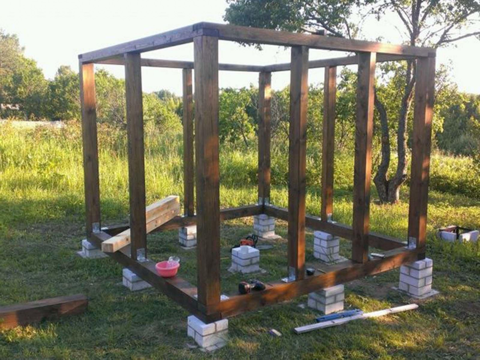 Твёрдо решив, что строение будет деревянным, надо найти брусья с сечением 10×10 см. Они станут столбами конструкции. Передние деревянные опоры должны быть на полметра выше устанавливаемых сзади.