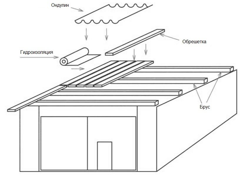 Ниже показан классический пример укладки кровли из ондулина поверх односкатной крыши. В случае с нашей беседки вместо бруса у нас используются обычные доски 25 на 100 мм, а гидроизоляция просто пропускается (хотя я бы вам рекомендовал обязательно выполнить этот этап).