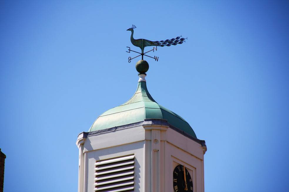 Компактный флажок вращается вокруг оси от порывов воздуха. Конструкция одновременно играет практичную и декоративную роль. Ранее устройство использовали для измерения силы ветра, потом стало оригинальным украшением крыши.