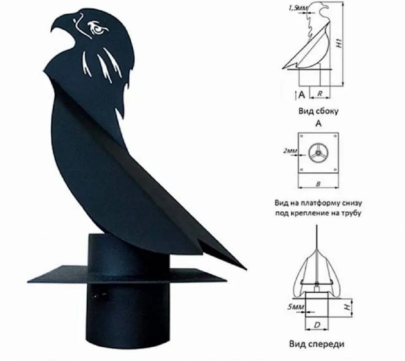 Флюгер – простой метеорологический прибор, который под воздействием воздуха поворачивается в сторону меньшего сопротивления. Конструкция наглядно показывает силу и направление ветра. Устройство защищает дымоход от порывов, препятствует возвращению смога обратно в жилье.
