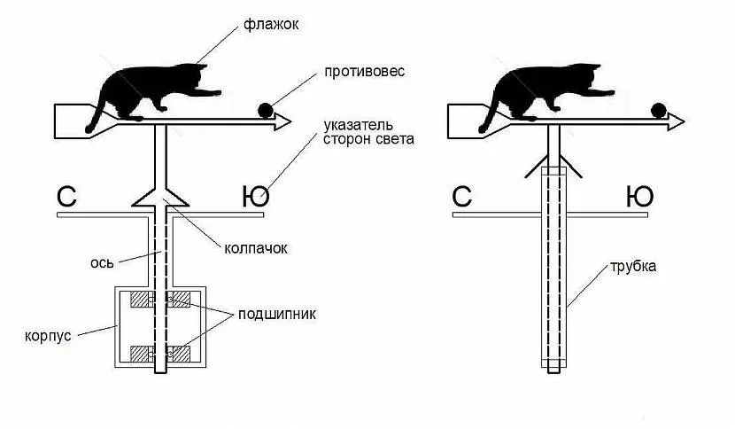 - Флюгарка — металлический, пластиковый или фанерный силуэт, закрепленный на поворотном стакане подшипника качения;