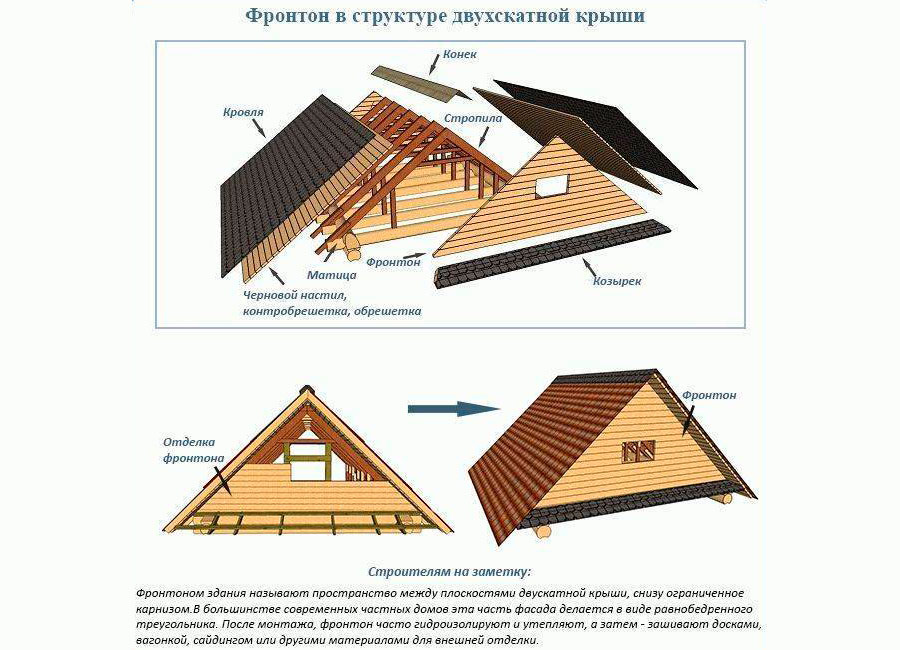 Фронтоном крыши называют трапециевидную или треугольную вертикальную часть. Она может быть как продолжением стены, так и отдельным элементом сложной конструкции