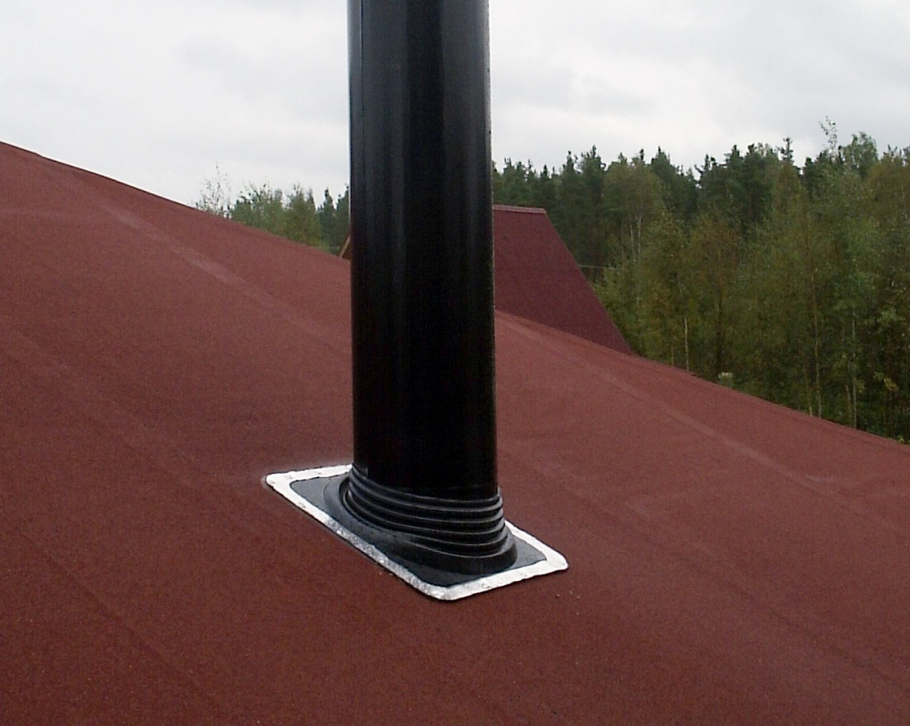 Вентиляционные трубы и дымоход на кровле из профлиста могут быть круглой формы и сделаны из оцинкованной стали. Зазор между ними и покрытием кровли заделать значительно легче. Для этих целей применяются эластичные проходки. Они гидроизолируют место примыкания профлиста и трубы. Проходки изготавливают для скатных и плоских крыш.