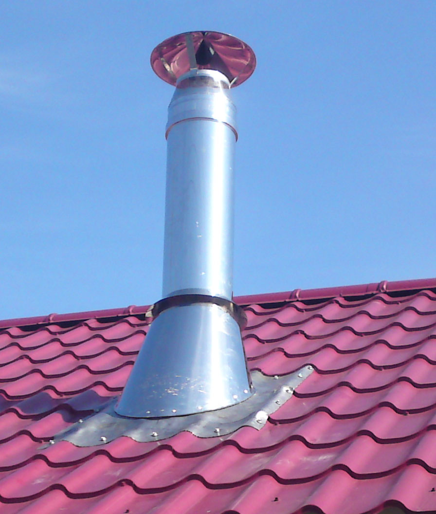 Многие печи комплектуются круглыми трубами, состоящими из нескольких слоев. Для герметизации швов вокруг такой трубы выпускаются уже готовые колпаки с фартуком. Они представляют собой оцинкованный лист с отверстием, к которому под наклоном закреплен конус. Лист фиксируется саморезами на обрешетке, труба заводится через отверстие в колпаке. Верхняя часть конуса обжимается вокруг трубы металлическим хомутом с прокладкой, обеспечивая герметичность соединения.