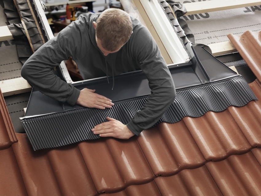 В первом случае обвод укладывается под черепицу. Его конструкция предусматривает специальный желобок, отводящий воду к водостоку. Места прилегания фартука к трубе замазывают специальным герметиком с высоким уровнем термостойкости, например, Локтайт, Хенкель, Макрофлекс.