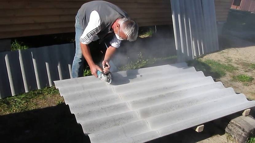 Перед тем как распилить шифер болгаркой, желательно намочить место среза.