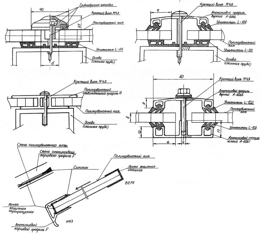 На чертеже ниже показаны другие схемы крепления поликарбоната к металлическому каркасу.