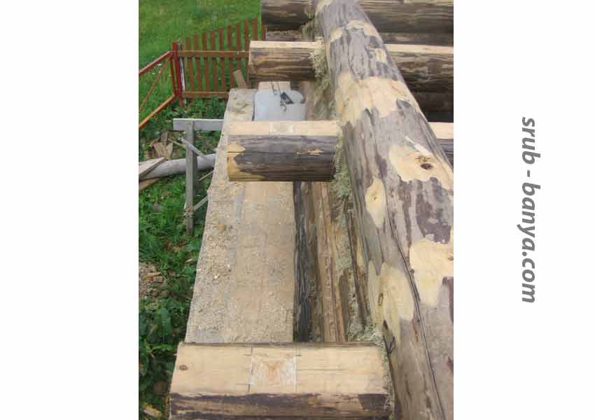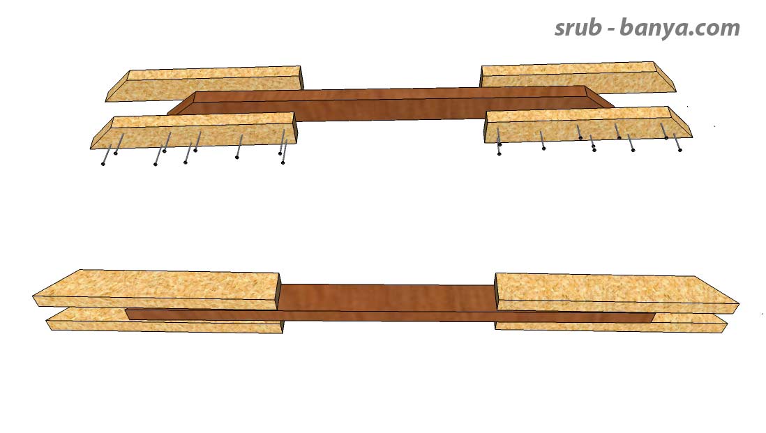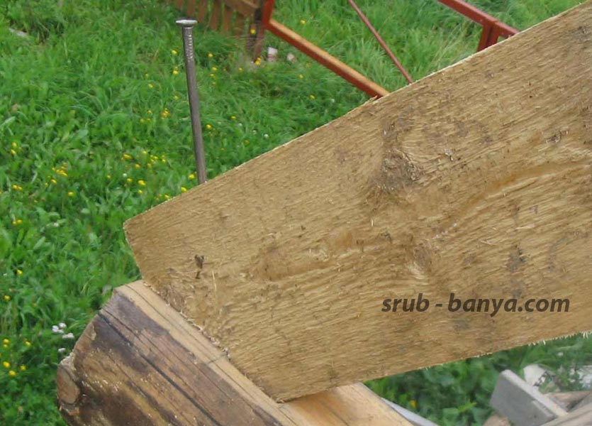 Для невидимой части стыки укрепляются обрезком от стропила длиной метр и более и крепят гвоздями 15 см при шаге расположения 10 см. Бывает, что брус имеет кривизну, но его можно установить. В этом случает, в систему он монтируется выпуклой стороной вверх. Для сруба это не имеет никакого значения.