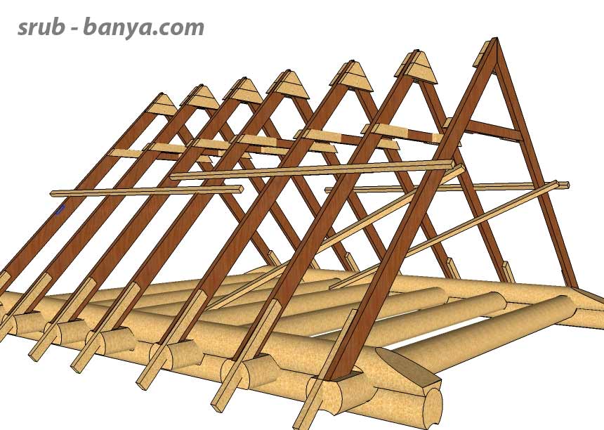 В простых домах, в основном каркасных, мауэрлат может быть и упразднен. В этом случае стропила крепятся к балкам перекрытия. Самый надежный вариант сборки такой системы – подготовка стропильных ферм. Каждая ферма состоит из двух стропильных ног, соединительного ригеля и нижней затяжки. Для прочности фермы усиливают центральными балками и подкосами: