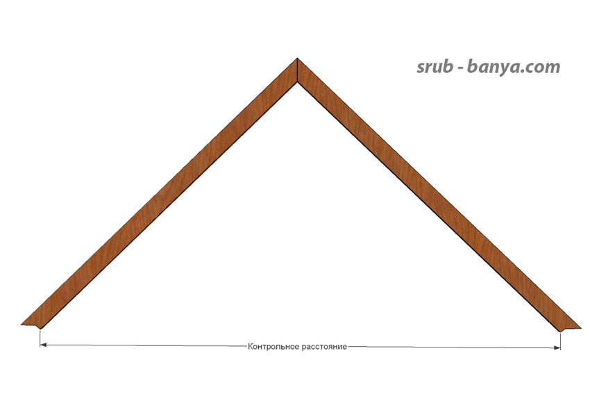 Шаг 1. Чтобы соединить стропила стык в стык, требуется отпилить их верхнюю часть так и под таким углом, чтобы два противоположно стоящих элемента сошлись друг с другом над коньковым брусом.
