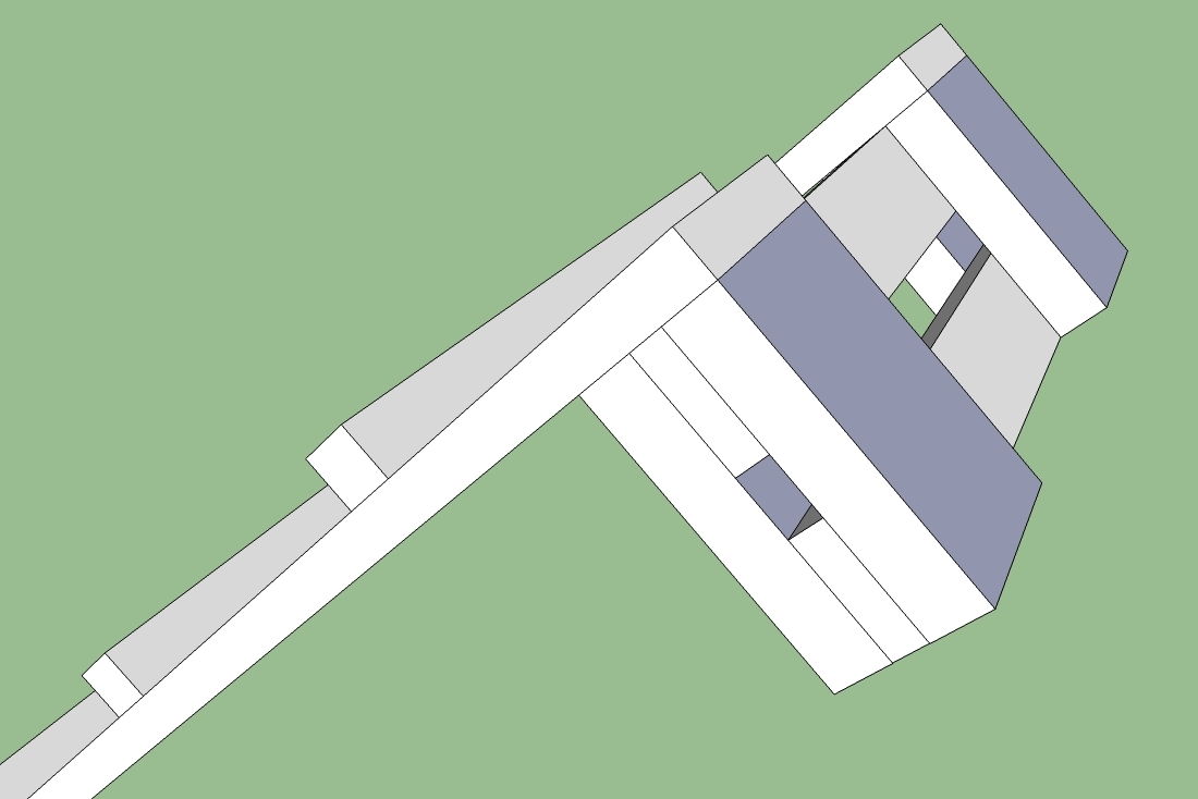 Теперь разберёмся с «крюком», который будет зацеплять лестницу за конёк крыши. Он должен быть максимально надёжно прикреплён к лестнице, для того чтоб выдержать её вес вместе с человеком. Для этого, я предлагаю, сколотить его из нескольких толстых досок, как показано на схеме №2. И уже эту конструкцию прибить несколькими гвоздями на 150-200 мм. Длина крюка должна быть 30 см и больше (чем больше, тем надёжнее). Иногда в противовес на другу сторону свешивают доску, а лестницу уже цепляют за неё. Угол между основанием лестницы и крюком, регулируйте клиньями или запиливанием крюка под соответствующим углом (в общем-то, ему не обязательно идеально совпадать с углом конька)