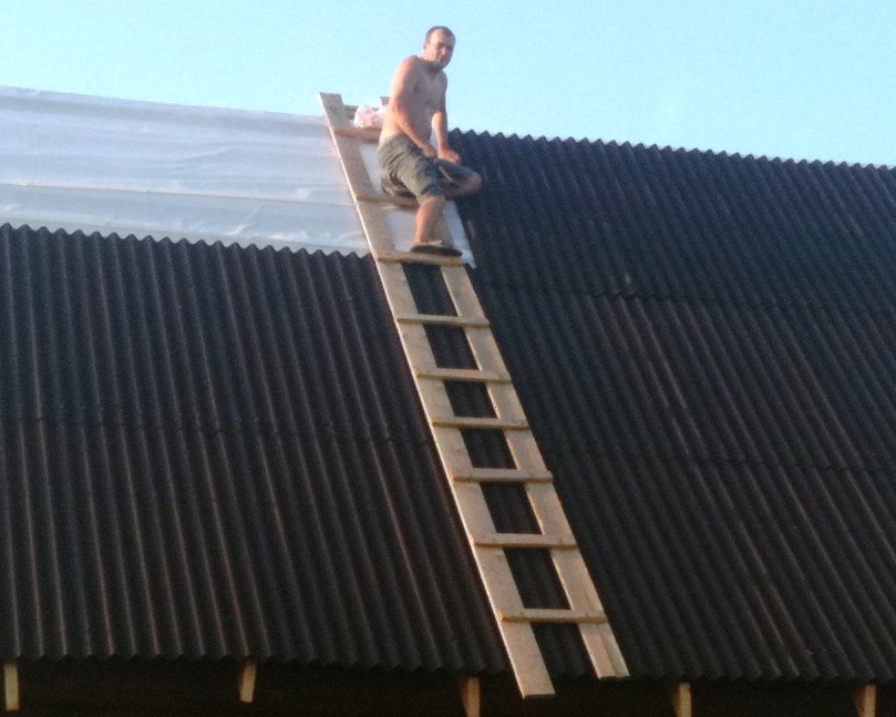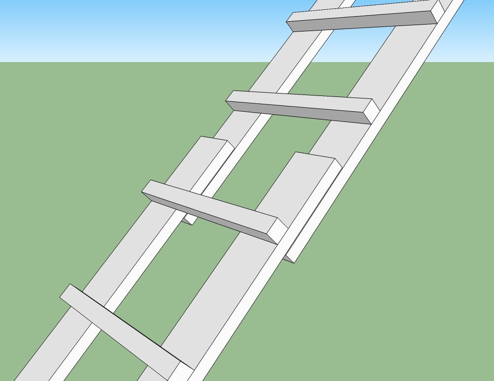 Для поперечен под ступеньки используйте бруски, на них удобнее стоять, чем на тонкой доске. Во-первых, ваша нога будет дальше от поверхности крыши, во-вторых, будет больше места для ступни, да и присесть на них удобнее. Это выяснено практическим путём, на фото вы видите лестницу, которой пользовался я, у неё тонкие ступеньки, что создавало определённые неудобства — ступни быстро уставали.